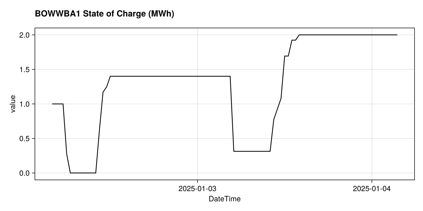 draw(plt; figure = (; size = (800, 400), title = "BOWWBA1 State of Charge (MWh)"))