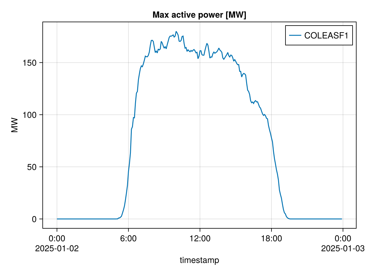 ax = Axis(fig[1, 1], xlabel = "timestamp", title = "Max active power [MW]", ylabel = "MW")