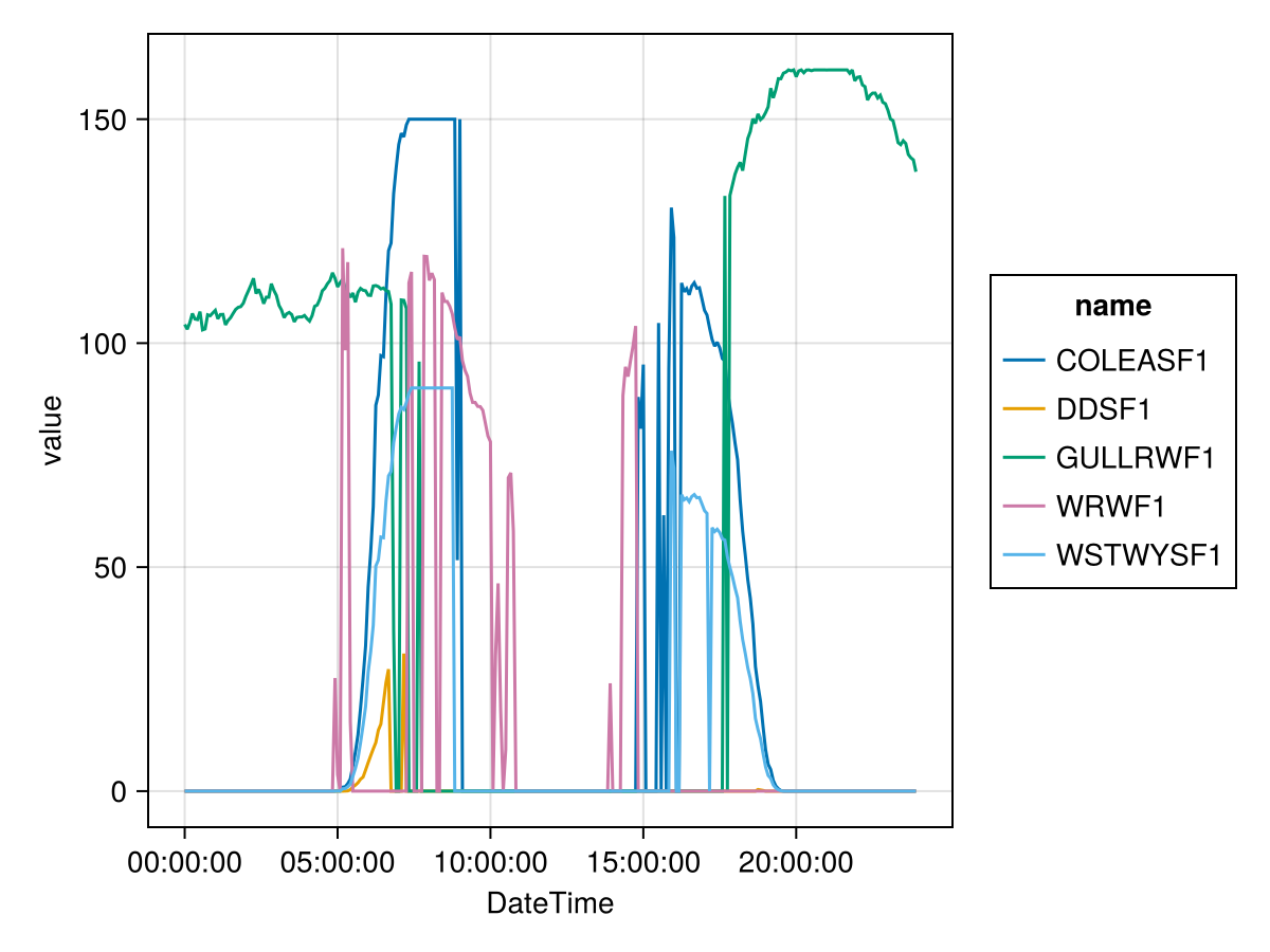 Notice that most solar generators are actually not dispatched during the day here even though the solar output is definitely non-zero.