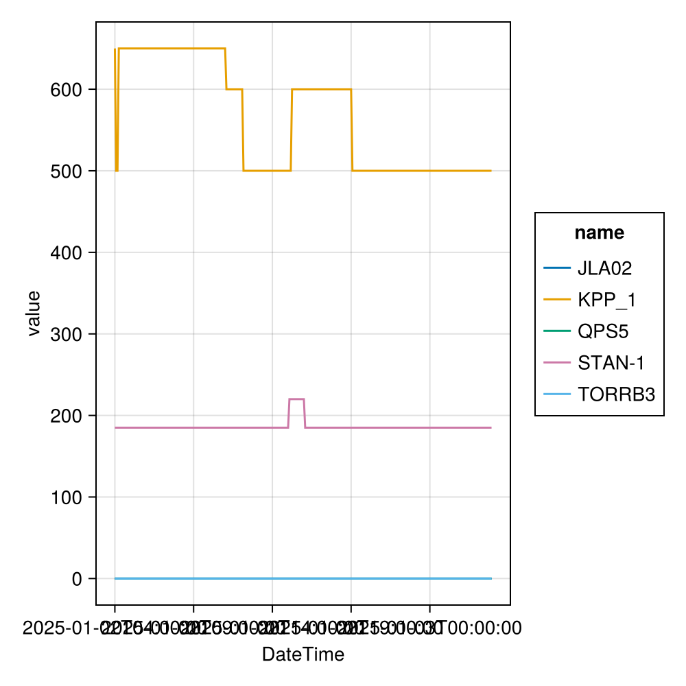 spec = data(sample) * mapping(:DateTime, :value, color = :name) * visual(Lines)